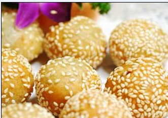 做法:將糯米粉150克用清水和成粉團(tuán),放人沸水中煮熟,然后加入350克生糯米粉、100克白糖揉成面團(tuán) 作為為皮料。將紅糖、白糖加適量清水煮熬成糖膠液,再加入爆谷花、花生仁和芝麻仁拌勻成餡,并趁熱按成小團(tuán)。然后取皮面 55克,包入餡料750克,搓成圓形,灑上一層水后,粘上一層芝麻,即成煎堆生坯。最后鍋內(nèi)加植物油燒至六七成熱,放入生坯, 炸至膨起呈圓形至熟即可。