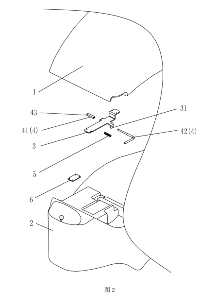 本實施例中,所述拉桿4包括可插入鎖扣板6下方的鎖扣銷41以及與鎖扣銷41端部固定連接的鎖扣拉桿42,所述彈簧5套裝在所述鎖扣拉桿42上。作為本次成果的優(yōu)選實施方式,拉桿4的鎖扣銷41端部設(shè)置有斜面43。